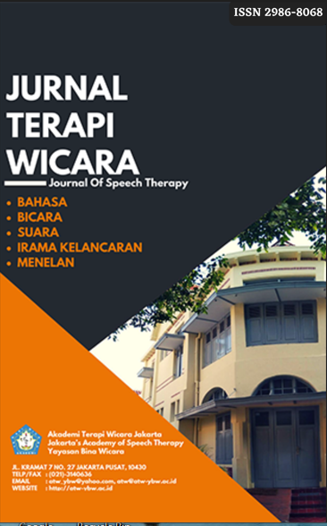 Jurnal Terapi Wicara (JAWARA) is a scientific journal containing publications on new ideas, theoretical and practical elaborations and case studies related to language disorders, speech, voice, dysfluency and swallowing. The existence of the JAWARA journal is a form of Politeknik Arutala Johana Hendarto [d.h. Akademi Terapi Wicara] to participate in a scientific reference source for skills and services in the field of speech therapy, child development, special education. neurolinguistics and other scientific communities related to the rehabilitation of swallowing and communication functions. This journal contains original articles, article reviews, and special case reports, community service report activities published by the Politeknik Arutala Johana Hendarto [d.h. Akademi Terapi Wicara] every twice a year.